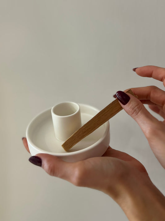 PIATTINO IN CERAMICA BIANCA PORTA PALOSANTO + 2 LEGNETTI