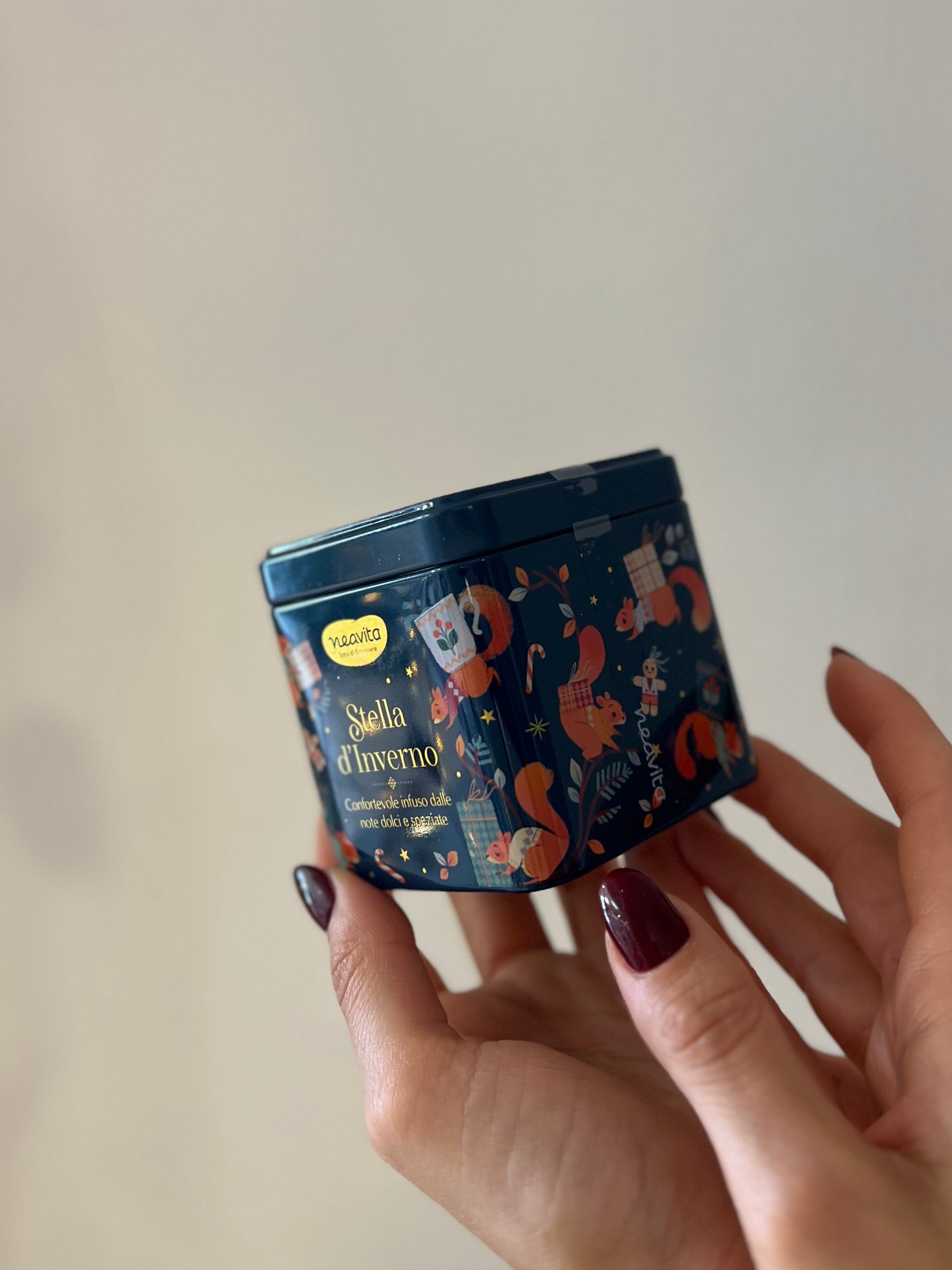 Un barattolino blu elegante, ideale da tenere in cucina o da regalare, che custodisce un infuso caldo e avvolgente.