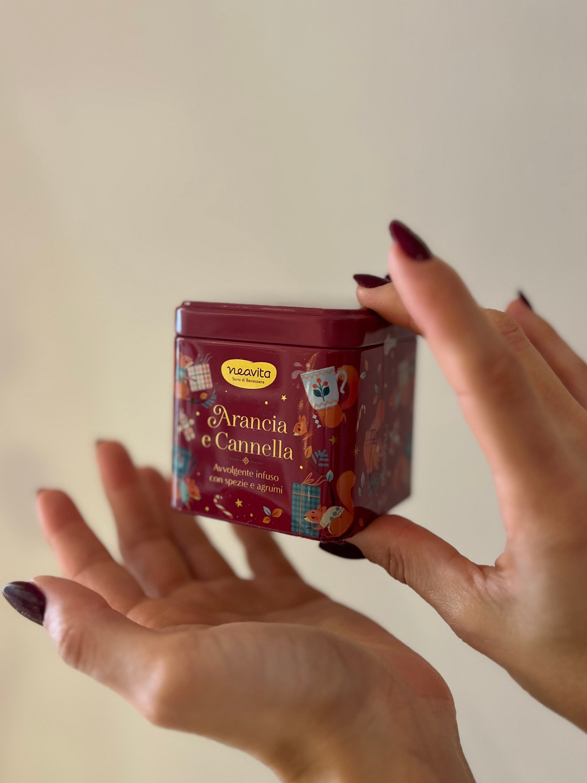 Un barattolino rosso elegante, perfetto da tenere in cucina o regalare, che custodisce un infuso caldo e profumato.