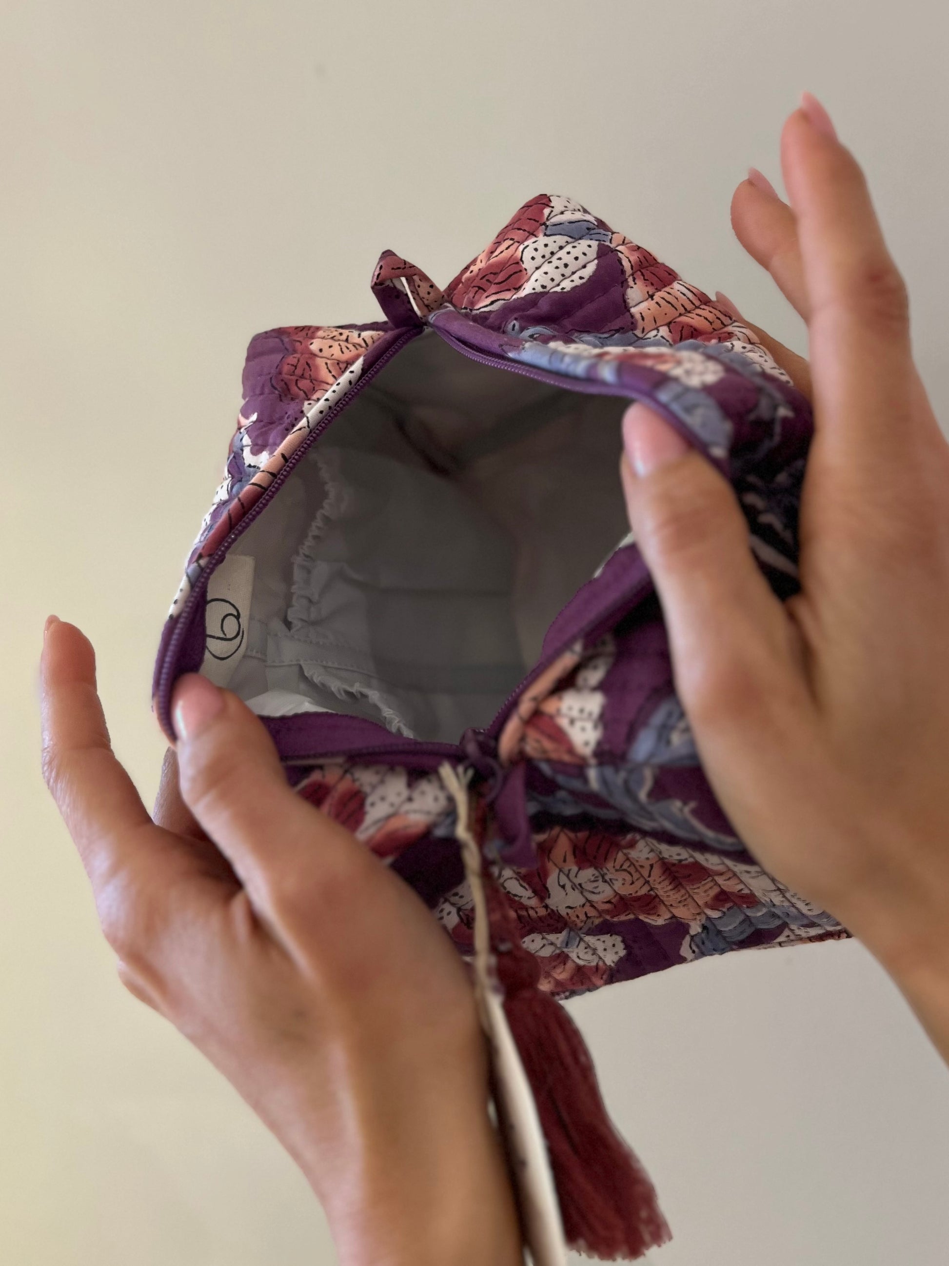 Questa pochette in cotone, realizzata artigianalmente con la tecnica del block print, è un accessorio pensato per accompagnarti ogni giorno. La base celeste è decorata da fiori bianchi con leggere striature rosa, circondati da eleganti motivi verdi: un disegno fresco e armonioso che la rende bella, capiente e mai scontata.