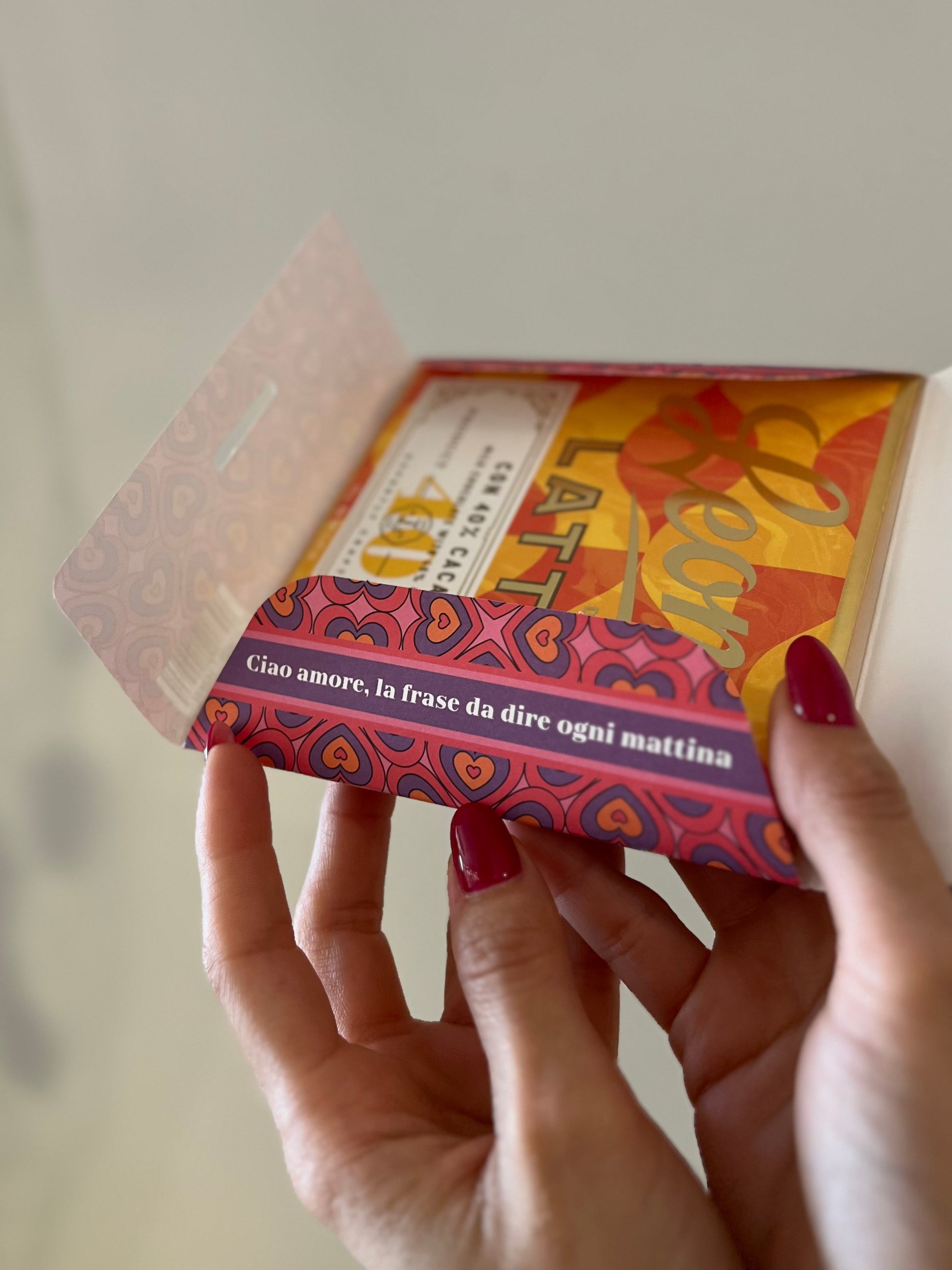 BIGLIETTO REGALO FIRMATO LEONE, "CIAO AMORE" CON CIOCCOLATO AL LATTE E 40% CACAO