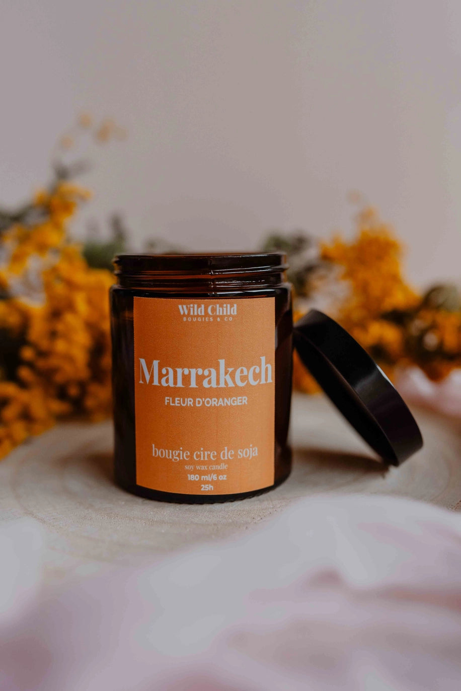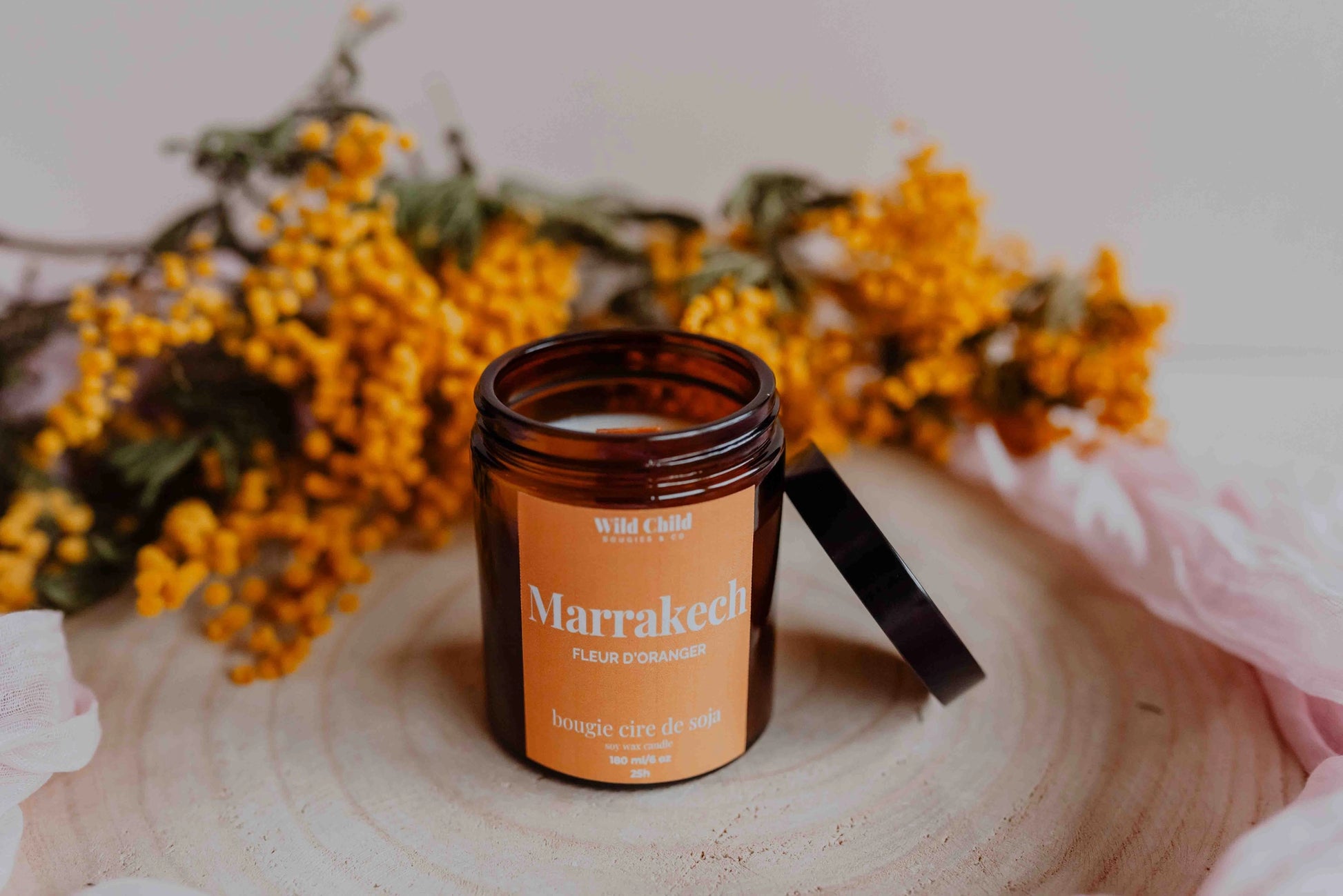 La candela Marrakech è una candela 100% naturale colata a mano a partire da cera di soia vegana, eco-responsabile e profumo di Grasse senza CMR (sostanze cancerogene, mutagene, reprotossiche) né ftalati.