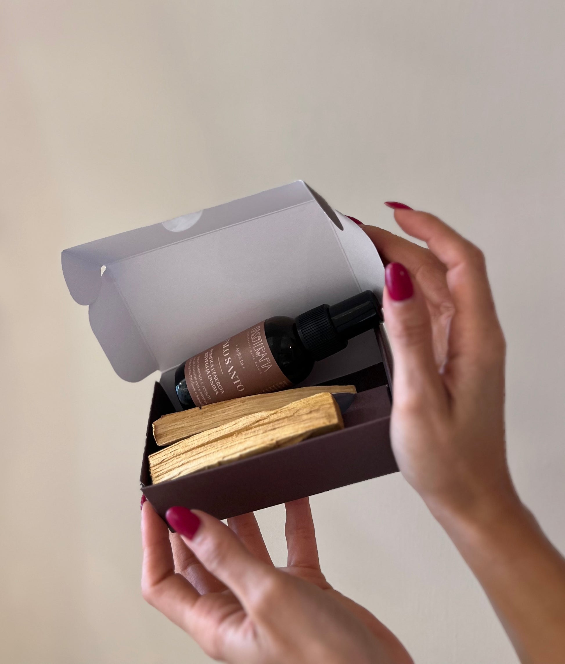 Questo cofanetto racchiude l’essenza sacra del legno di Palo Santo, combinando due legni peruviani e lo spray ambiente e tessuti Aura. Come in una perfetta alchimia, il profumo del Palo Santo si diffonde delicatamente, donando equilibrio, quiete e armonia, trasformando ogni spazio in un luogo ideale per meditazione, relax o semplicemente per ritrovare la presenza.