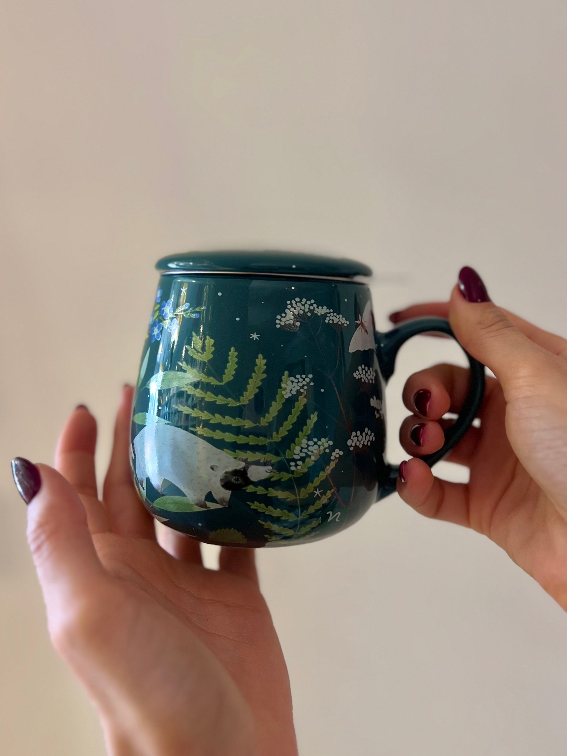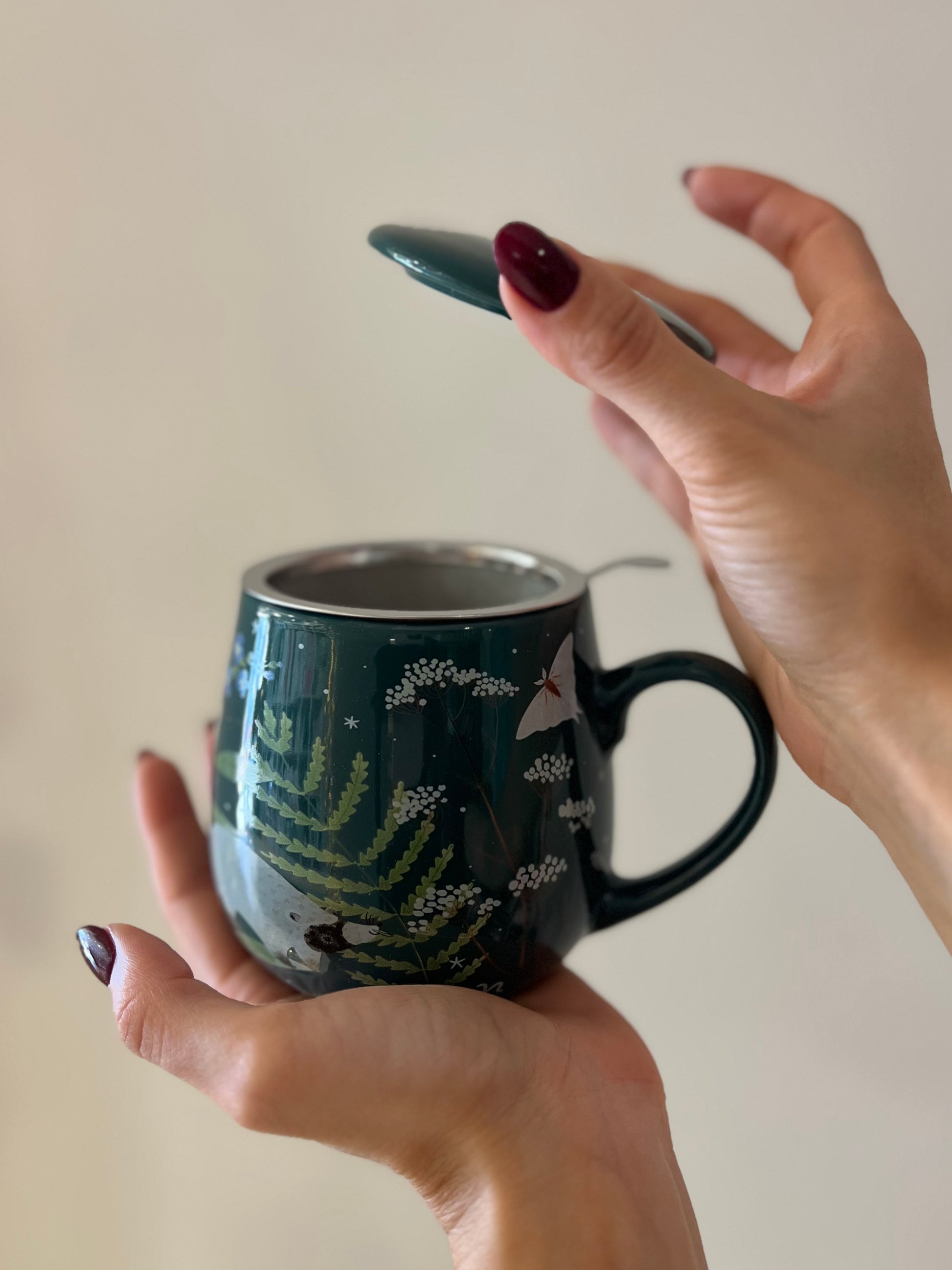 L’Infusiera Verde è una tazza in ceramica interamente verde decorata con fiori del bosco, farfalle svolazzanti e un piccolo tasso curioso. Ogni dettaglio richiama la magia della natura, trasformando la tua pausa tè in un momento fiabesco e rilassante.