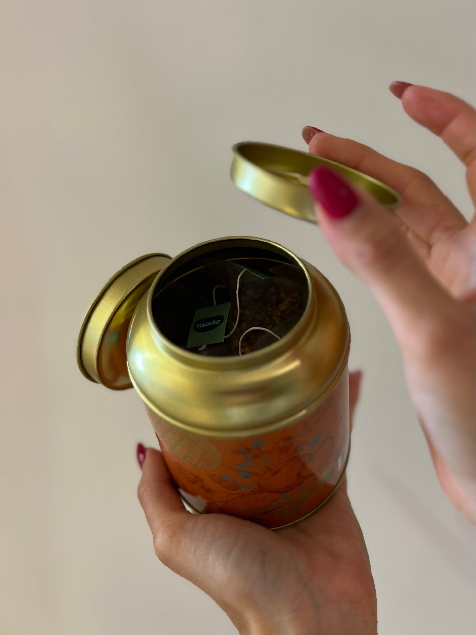 La scatola in latta color oro, elegante e preziosa, custodisce 12 filtroscrigno ed è un piccolo oggetto da collezione: da esporre, riutilizzare o regalare a chi ama i gesti lenti e le coccole aromatiche.