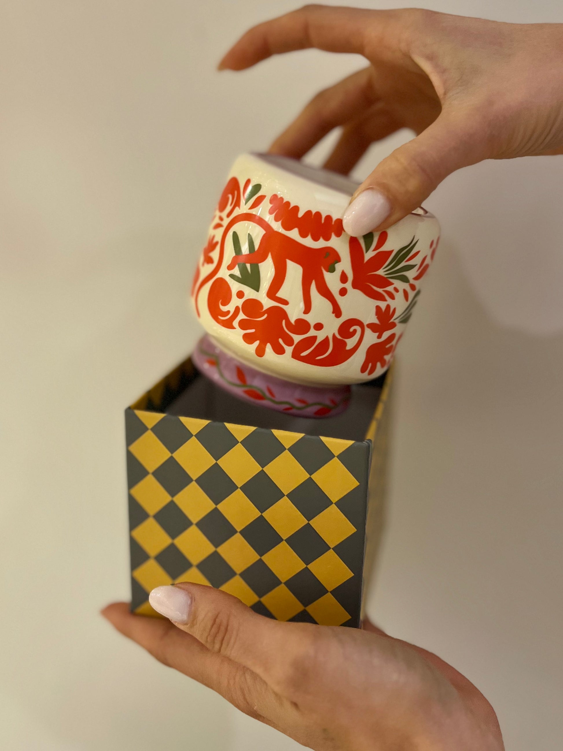 La cera di soia naturale racchiude fragranze intense e vibranti, scelte per armonizzarsi con il design fantasioso della ceramica e risvegliare i sensi. Ogni candela si abbina perfettamente ai nuovi coordinati della collezione, creando un insieme ricco di personalità e atmosfera.