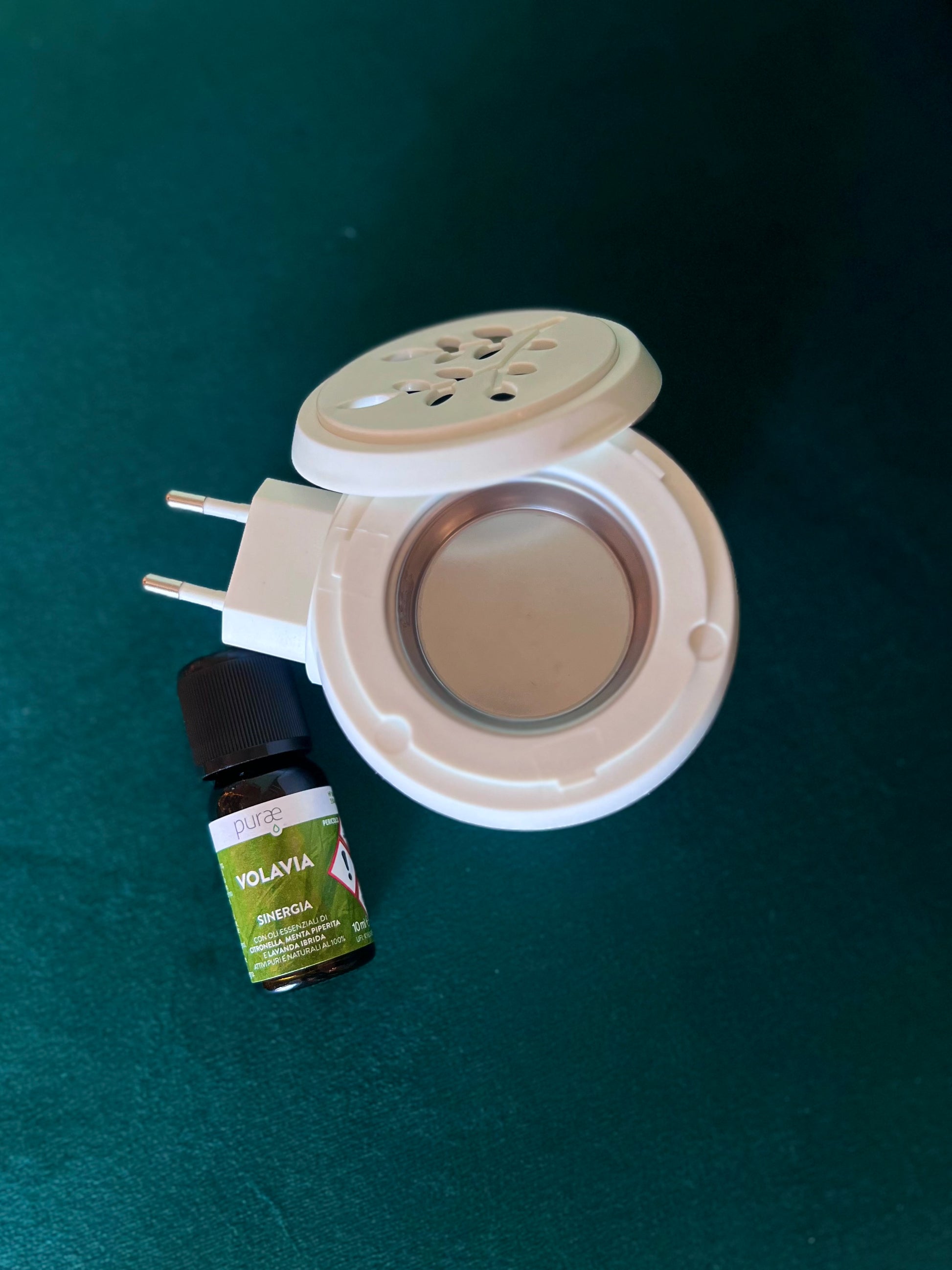 MODO D’USO: Aggiungere 10-15 gocce della sinergia Volavia nell’apposita vaschetta del diffusore, inserirlo nella presa e accendere l’interruttore. Sia per interno che per esterno.