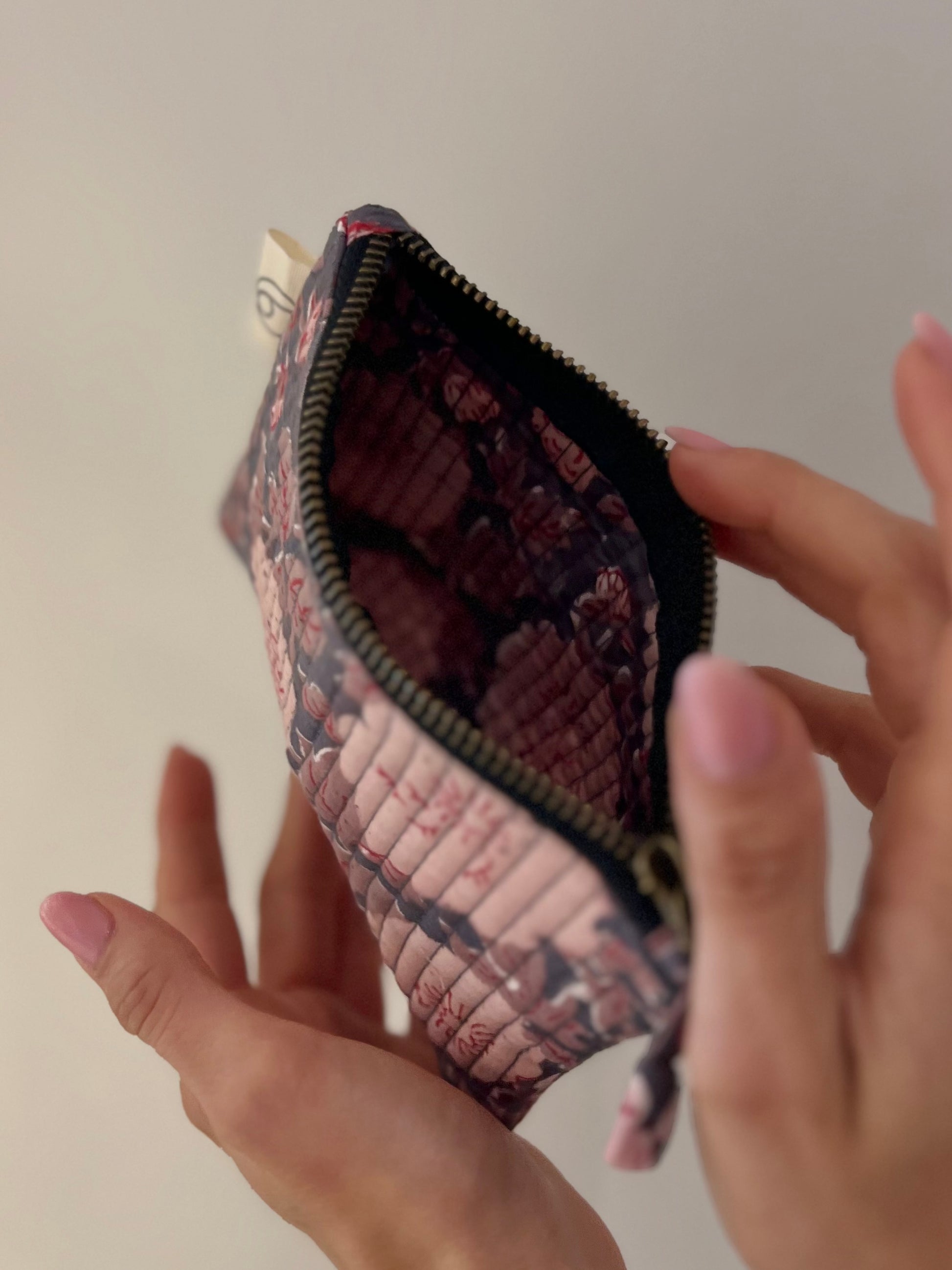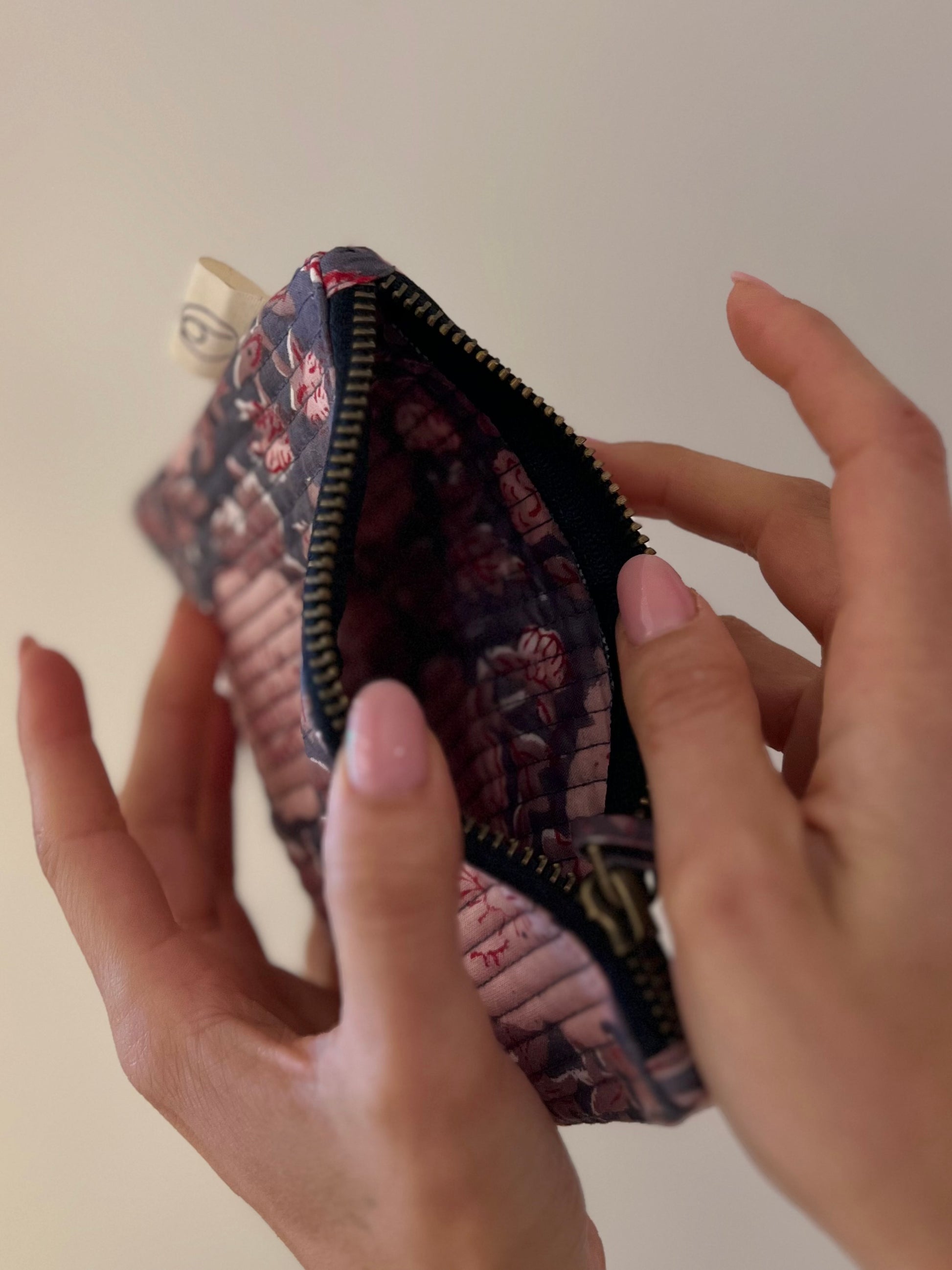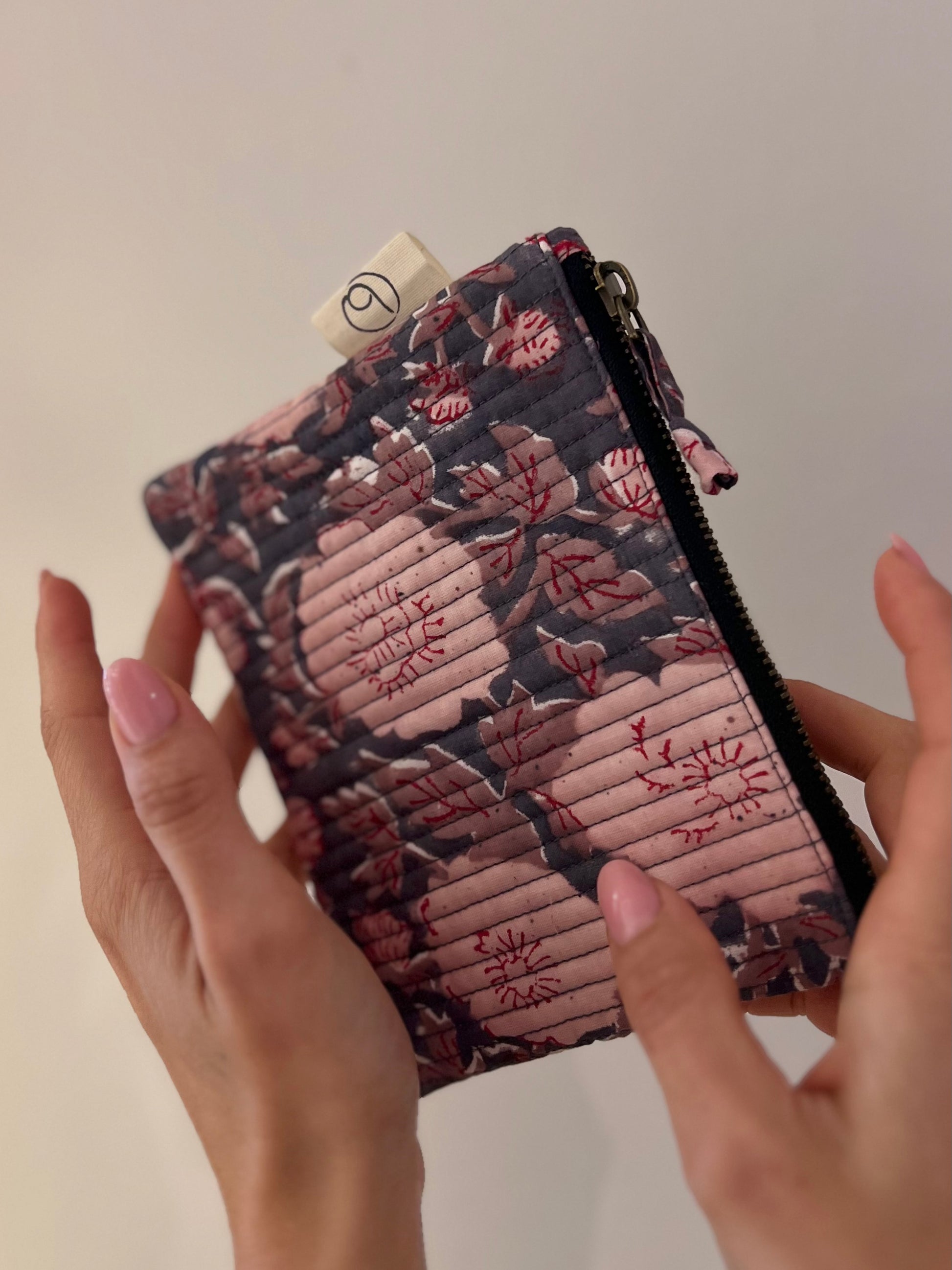 Questa mini pochette in cotone, realizzata artigianalmente con la tecnica del block print, è un accessorio versatile pensato per accompagnarti ogni giorno