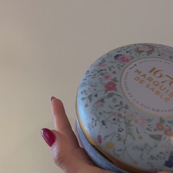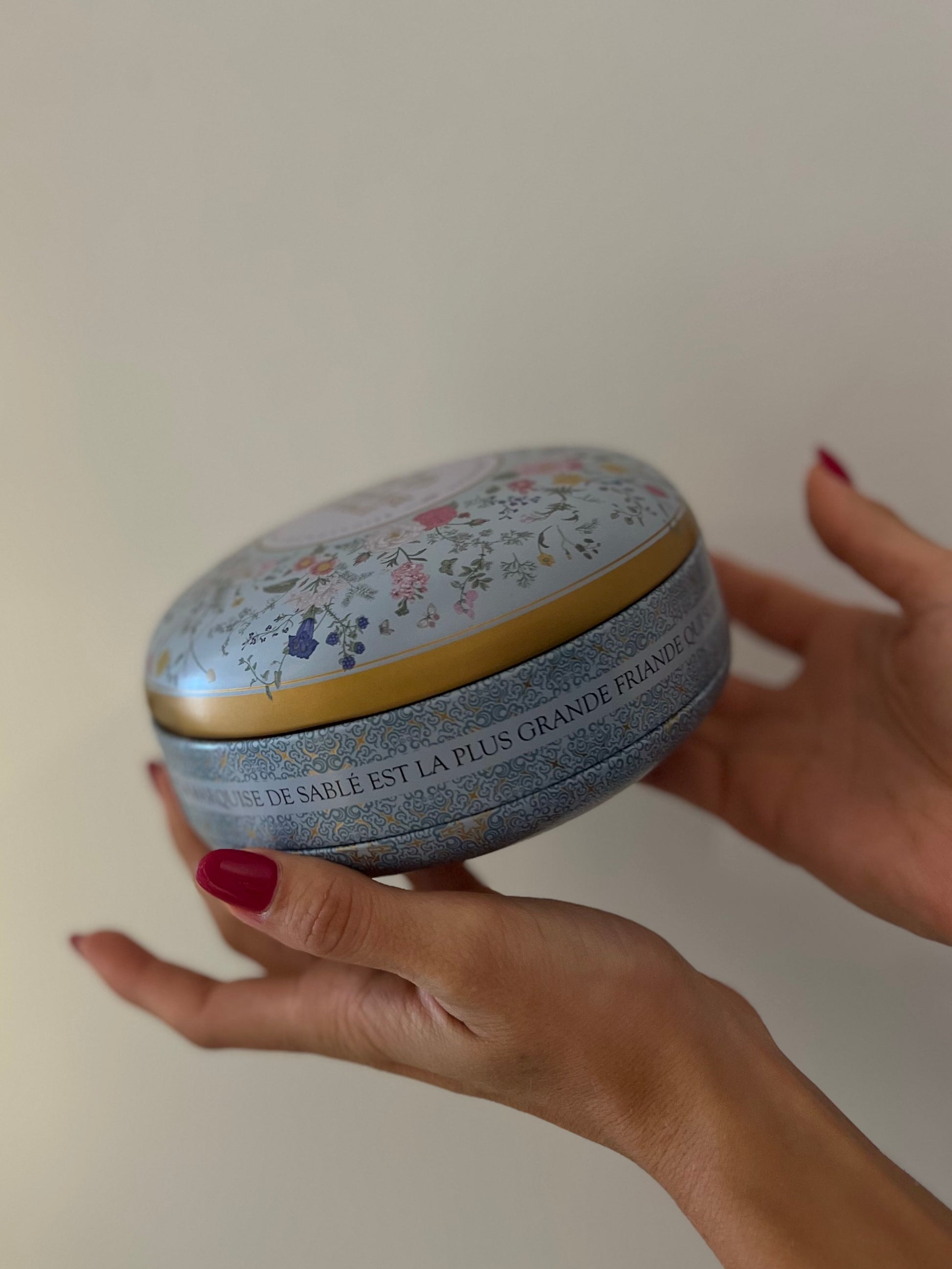 Questa raffinata scatola di metallo "Wild Bouquet" colpisce per il suo elegante decoro dai colori bluastri e dorati, trasformandosi in un vero oggetto da collezione. All’interno, custodisce i celebri Petit Sablé, biscotti realizzati con puro burro fresco e impreziositi da croccanti gocce di caramello al burro salato, per un gusto avvolgente e irresistibile.