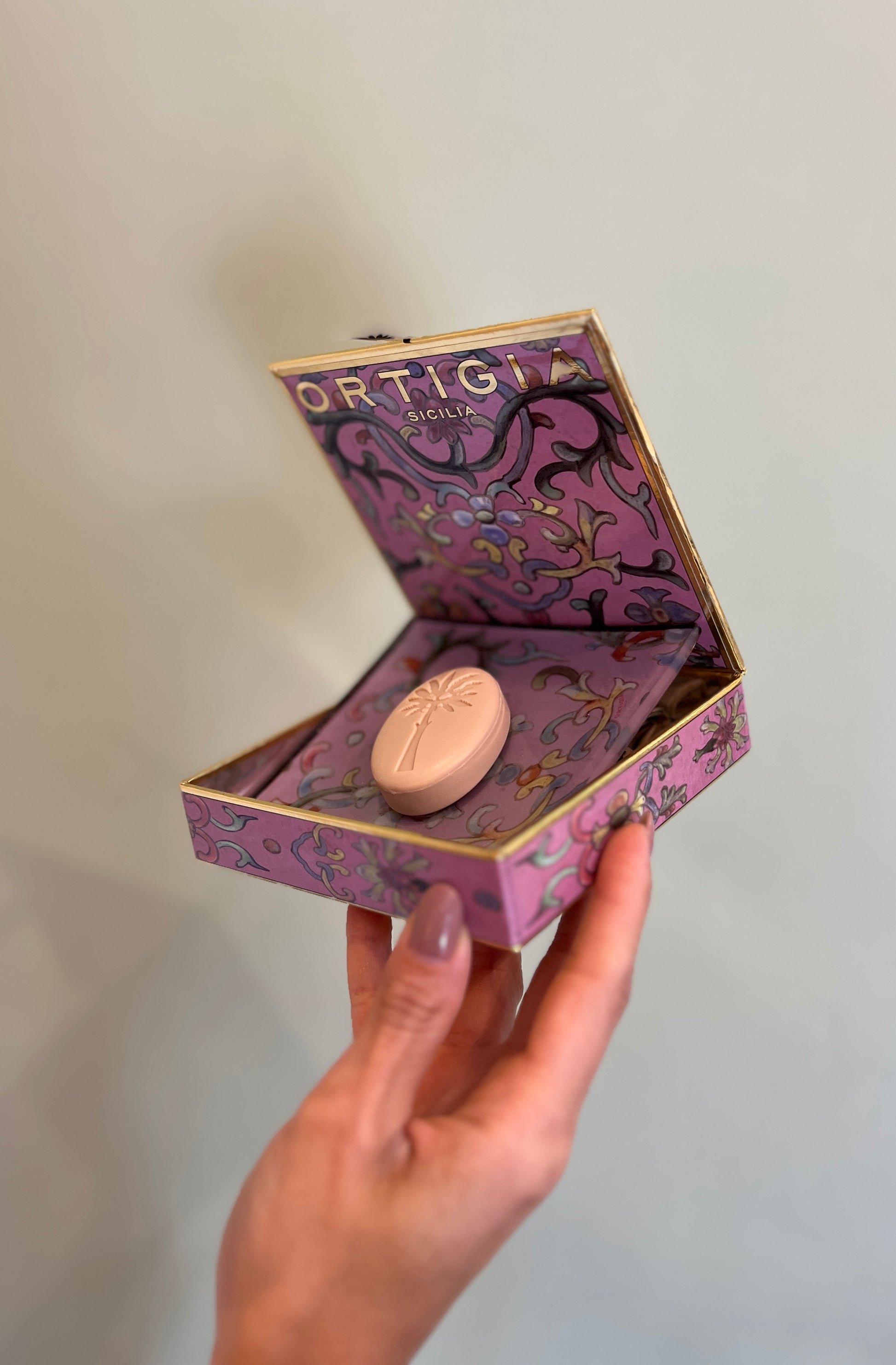 Una scatola incantevole custodisce un piatto di vetro, impreziosito da una stampa serigrafica, insieme al suo sapone ARAGONA