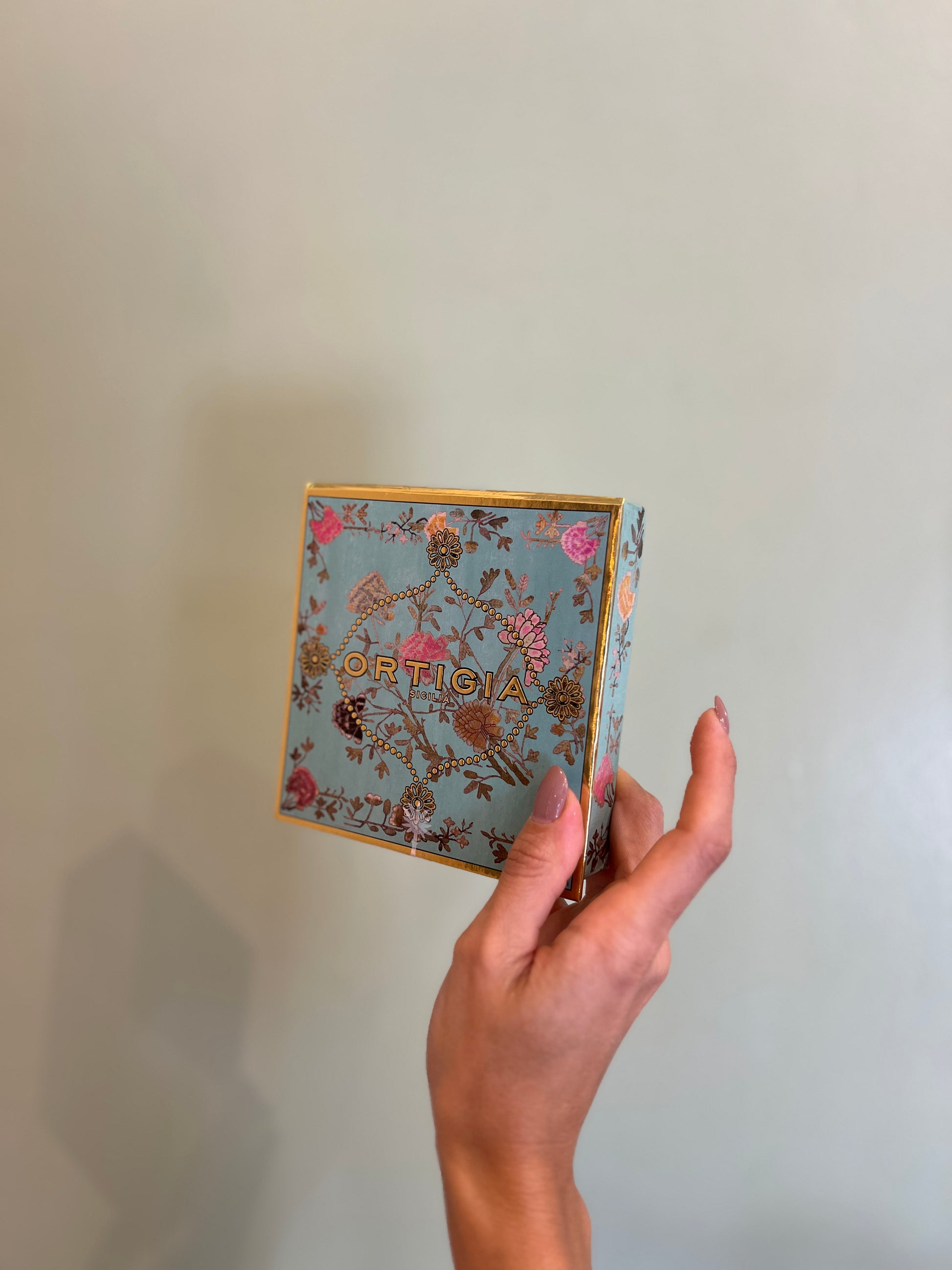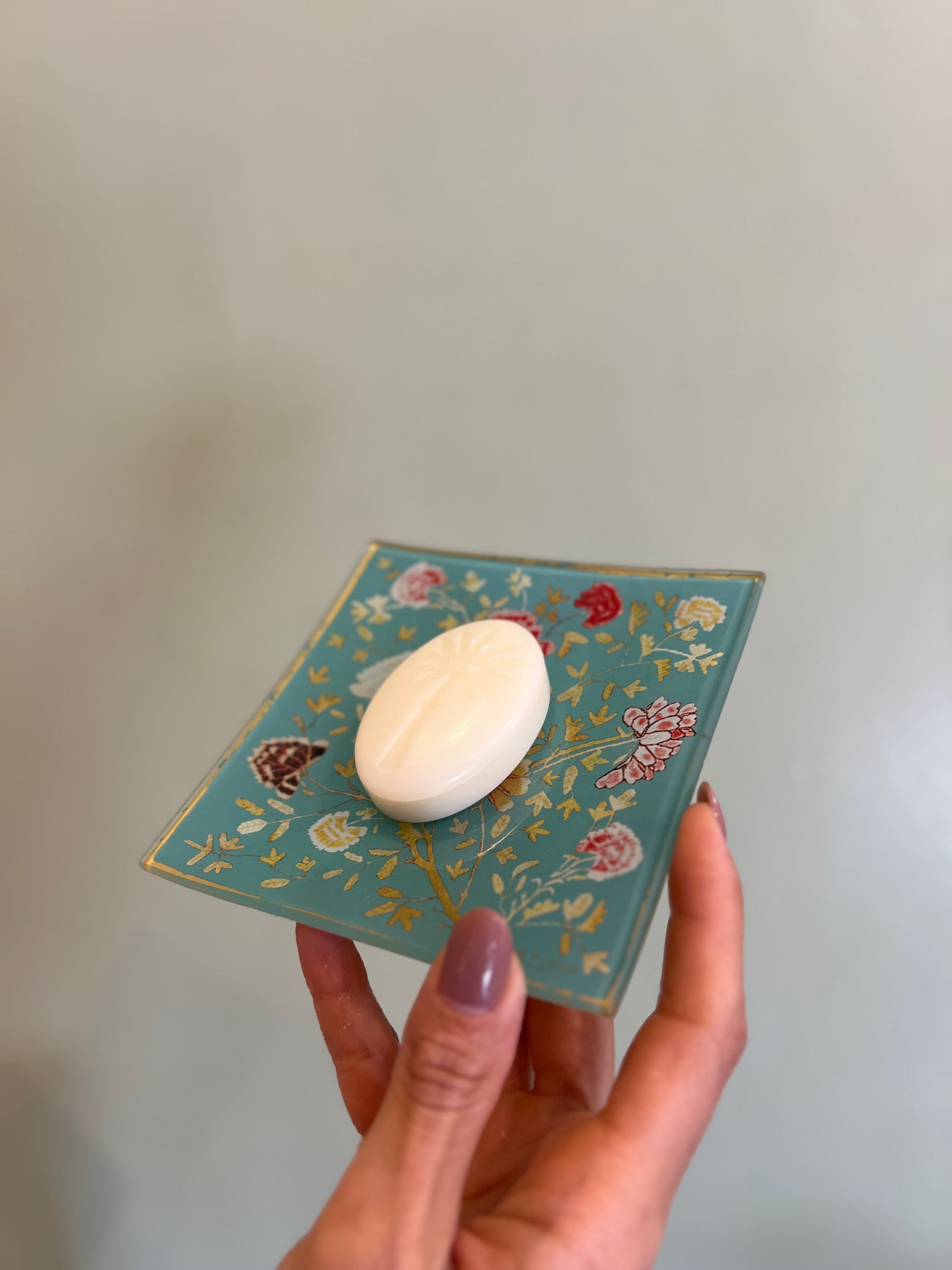 Una scatola incantevole custodisce un piatto di vetro, impreziosito da una stampa serigrafica, insieme al suo sapone FLORIO