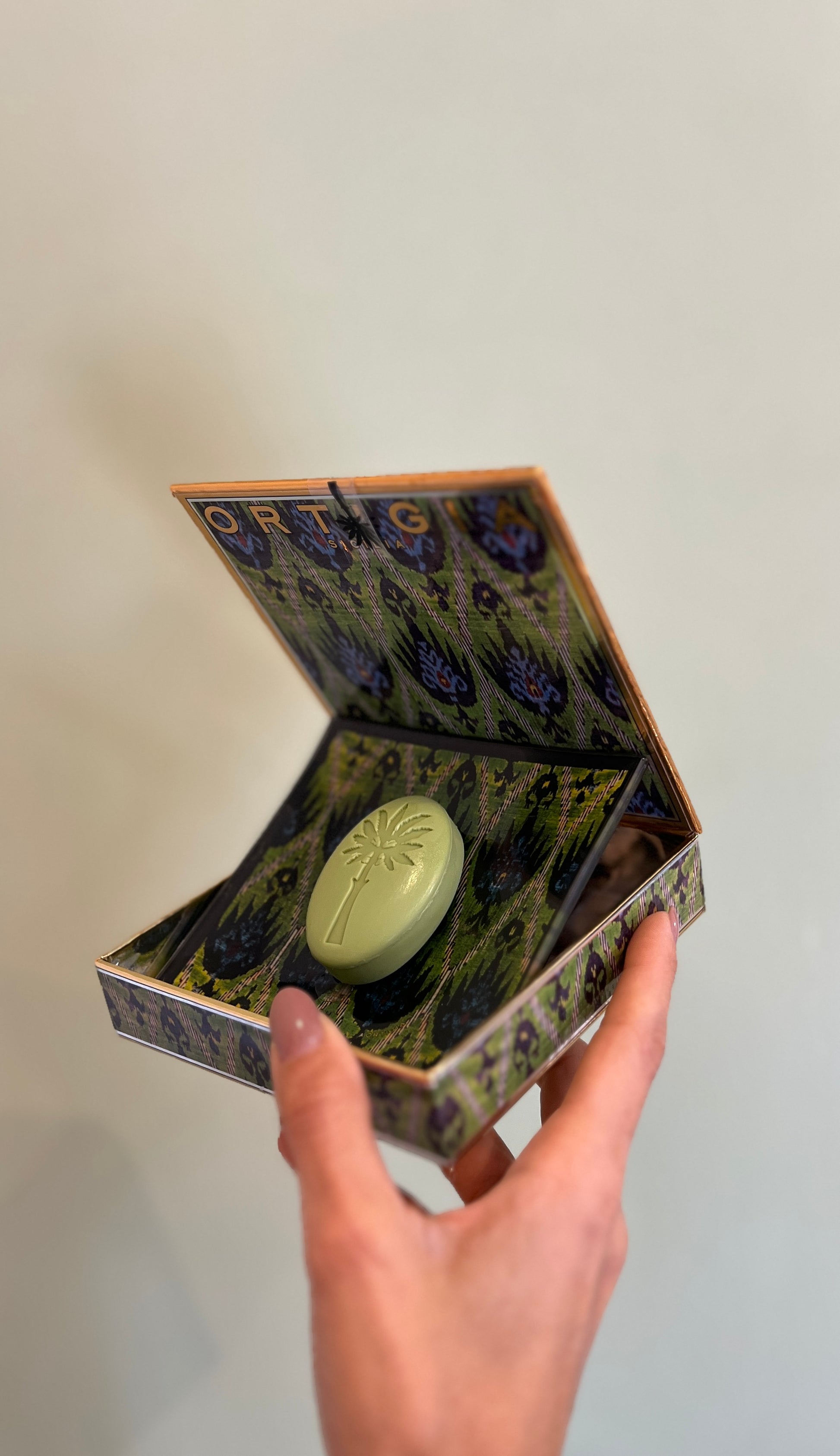 Una scatola incantevole custodisce un piatto di vetro, impreziosito da una stampa serigrafica, insieme al suo sapone BERGAMOTTO