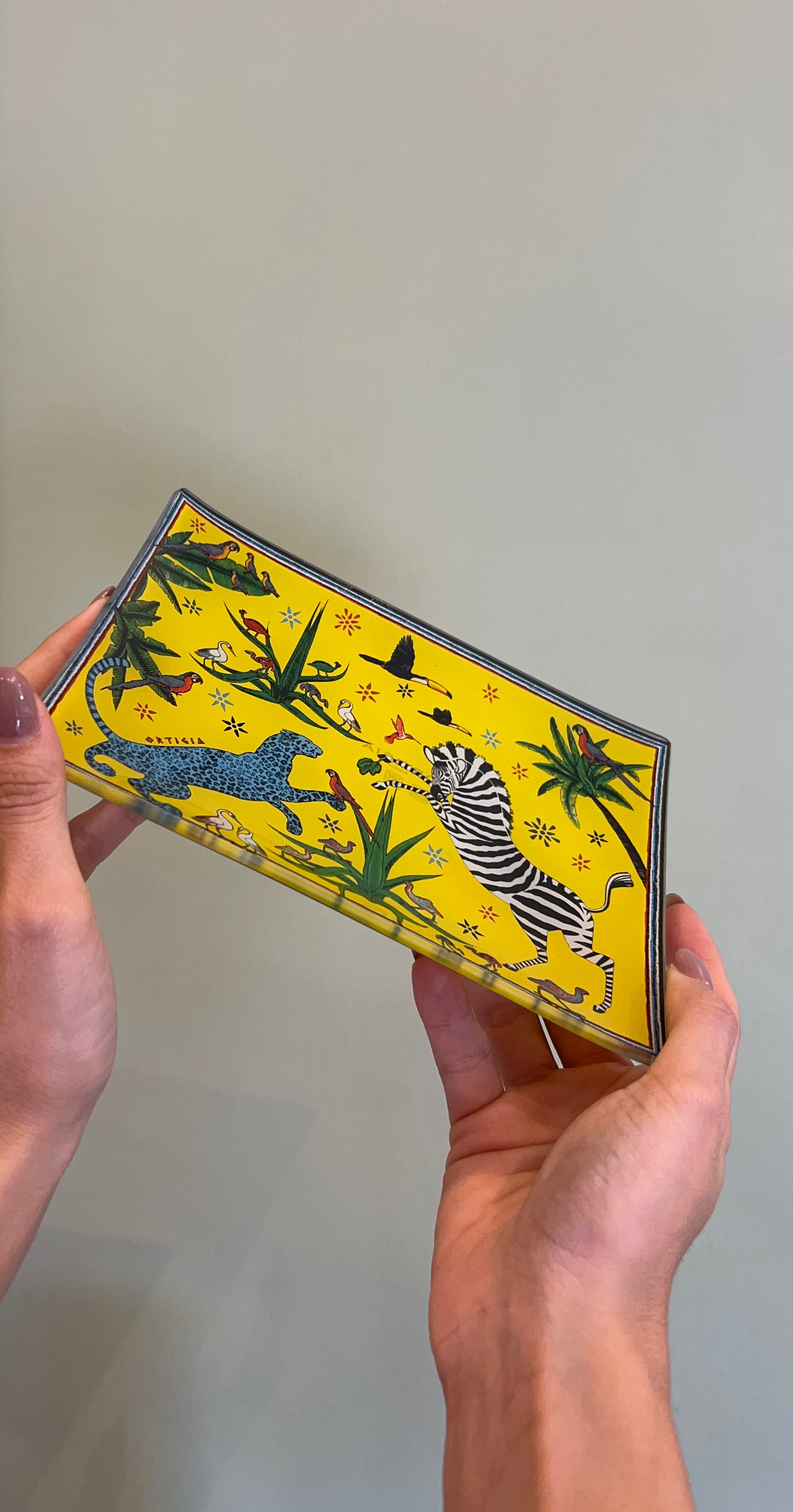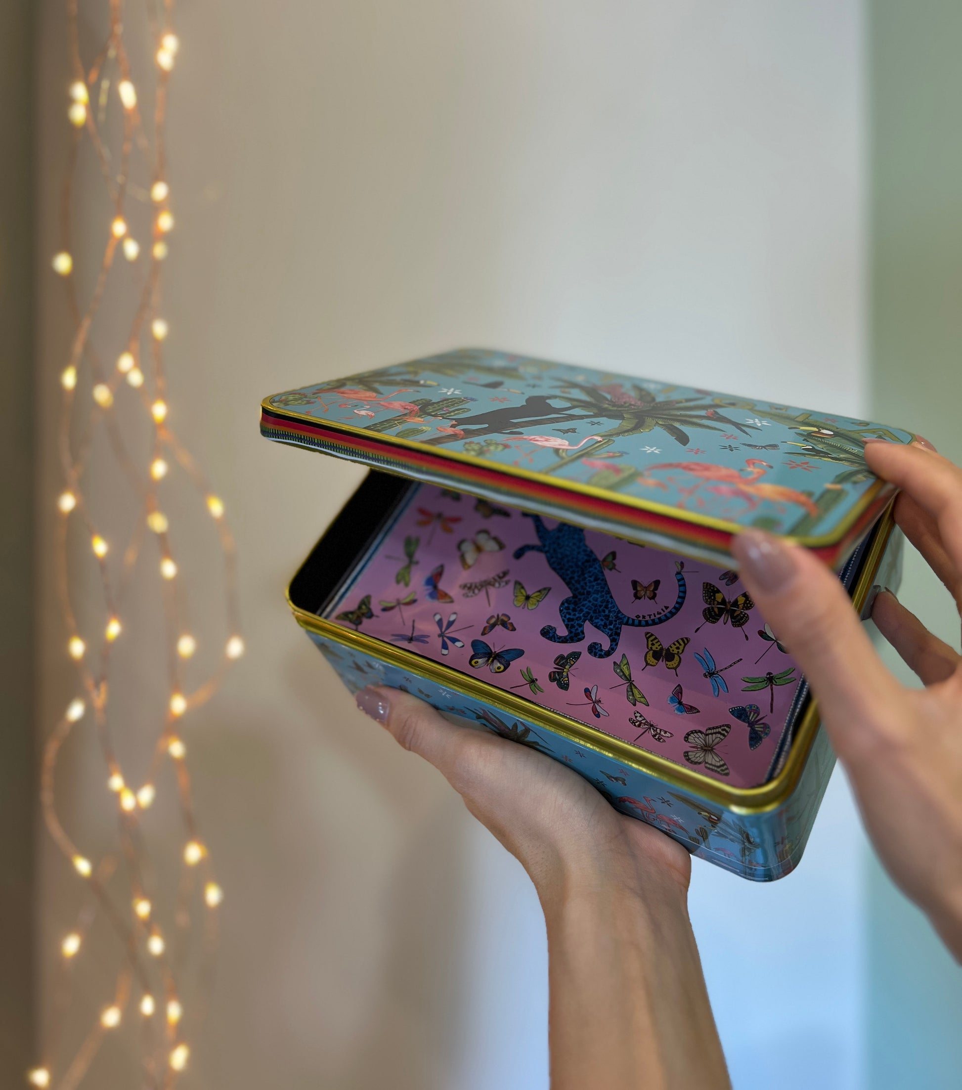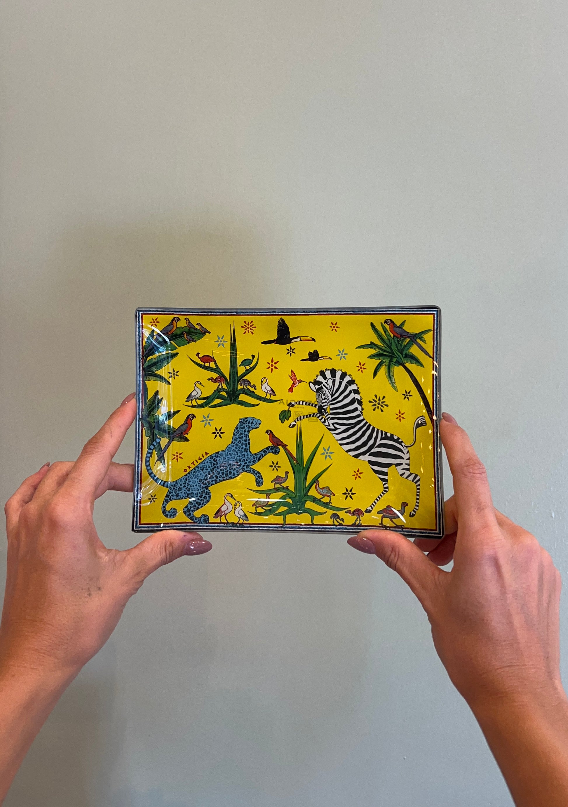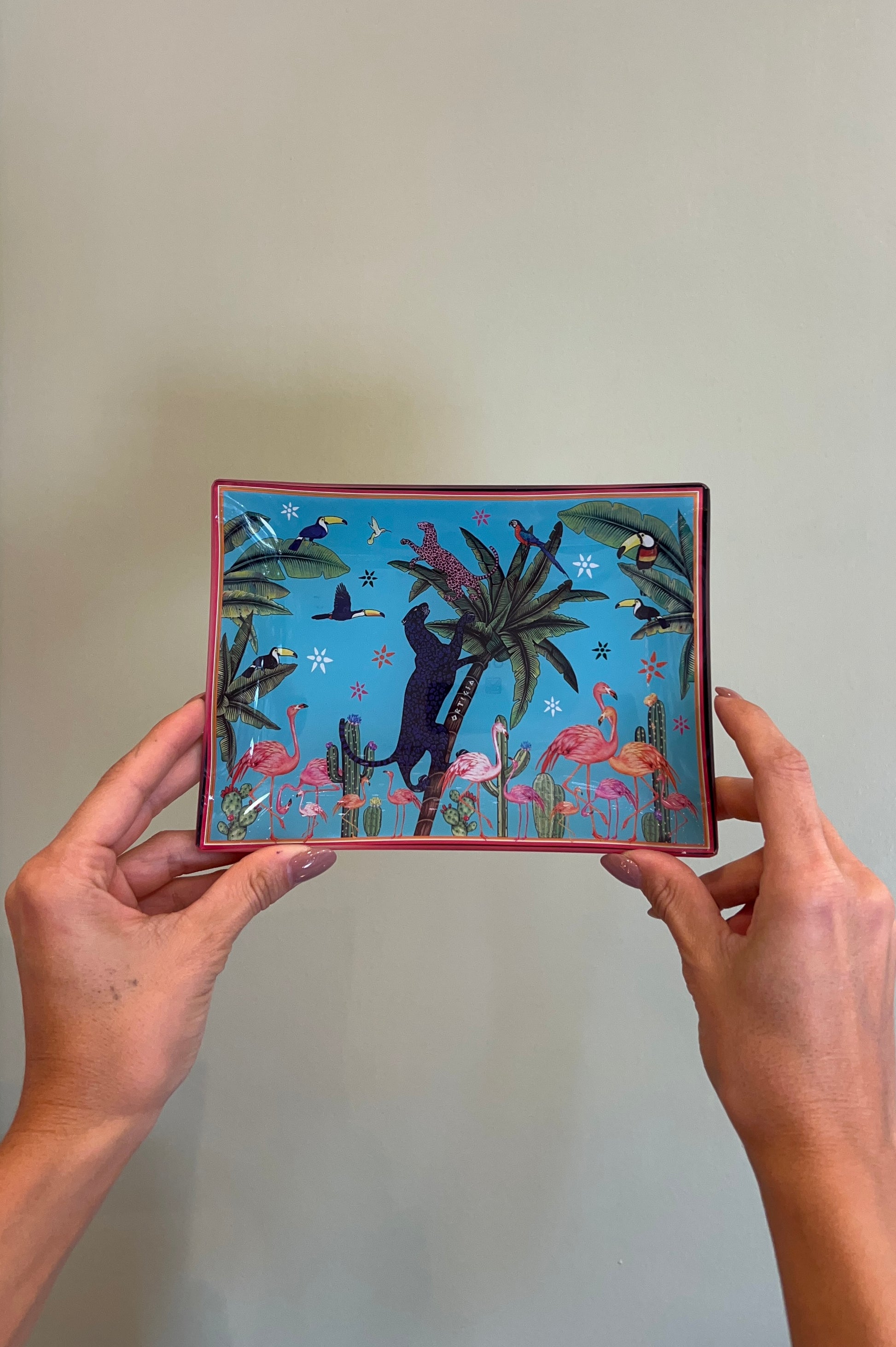 Scatola in latta decorata, custode di quattro piattini in vetro che evocano mondi incantati: la maestosità della Palma, il mistero della Giungla, la delicatezza delle Libellule, e l’eleganza del Fishy.