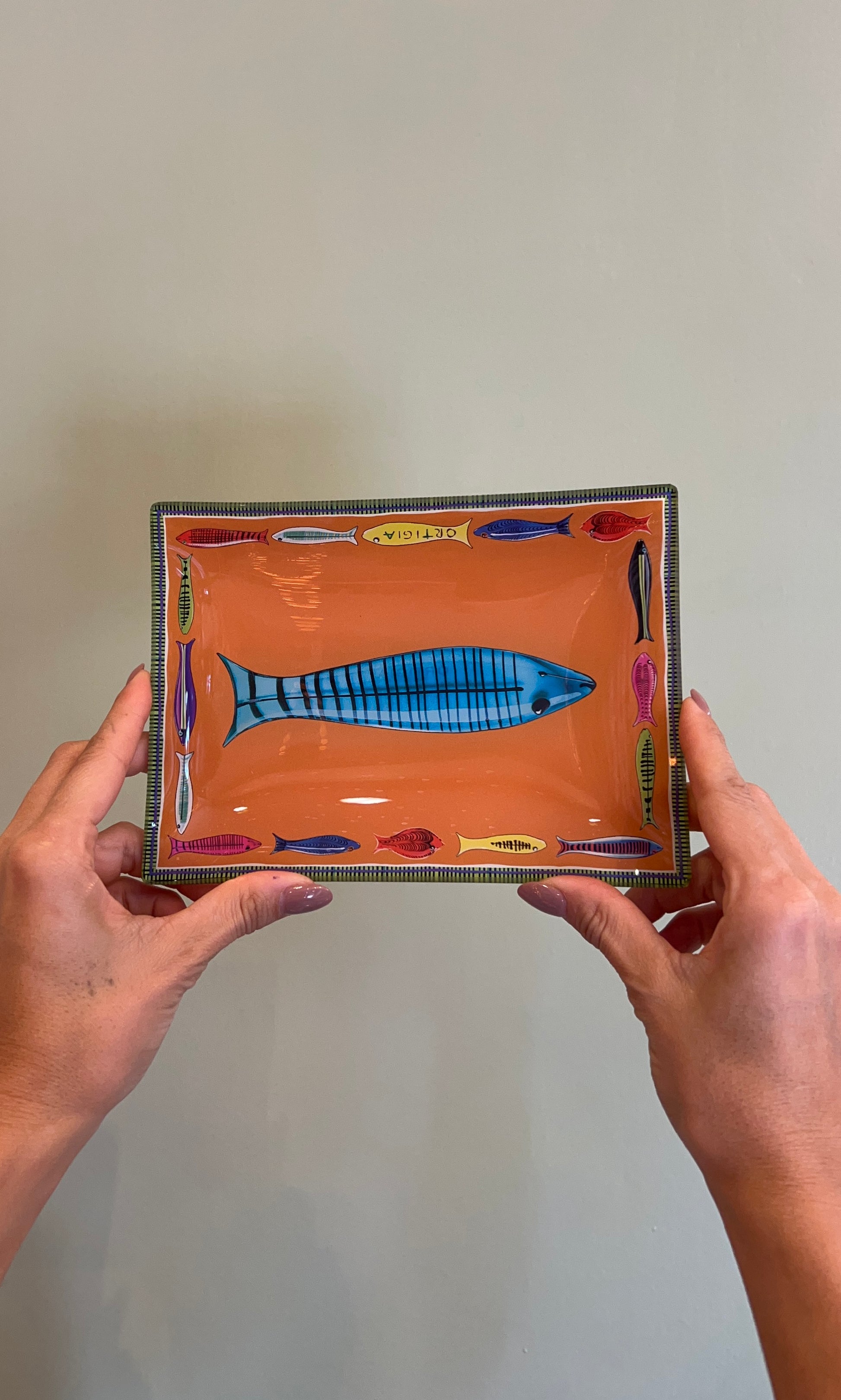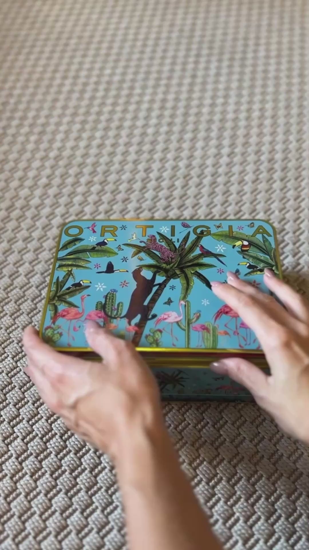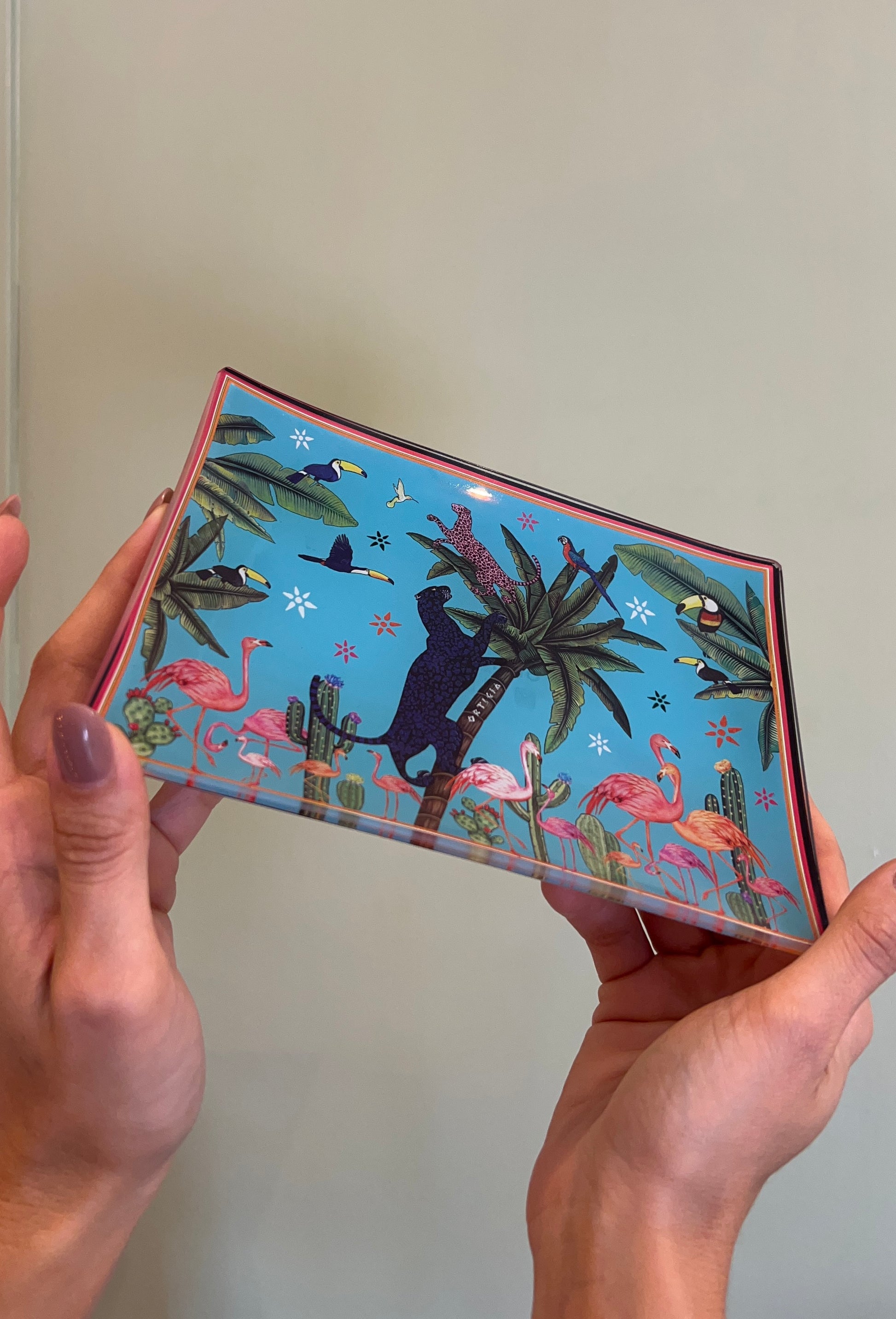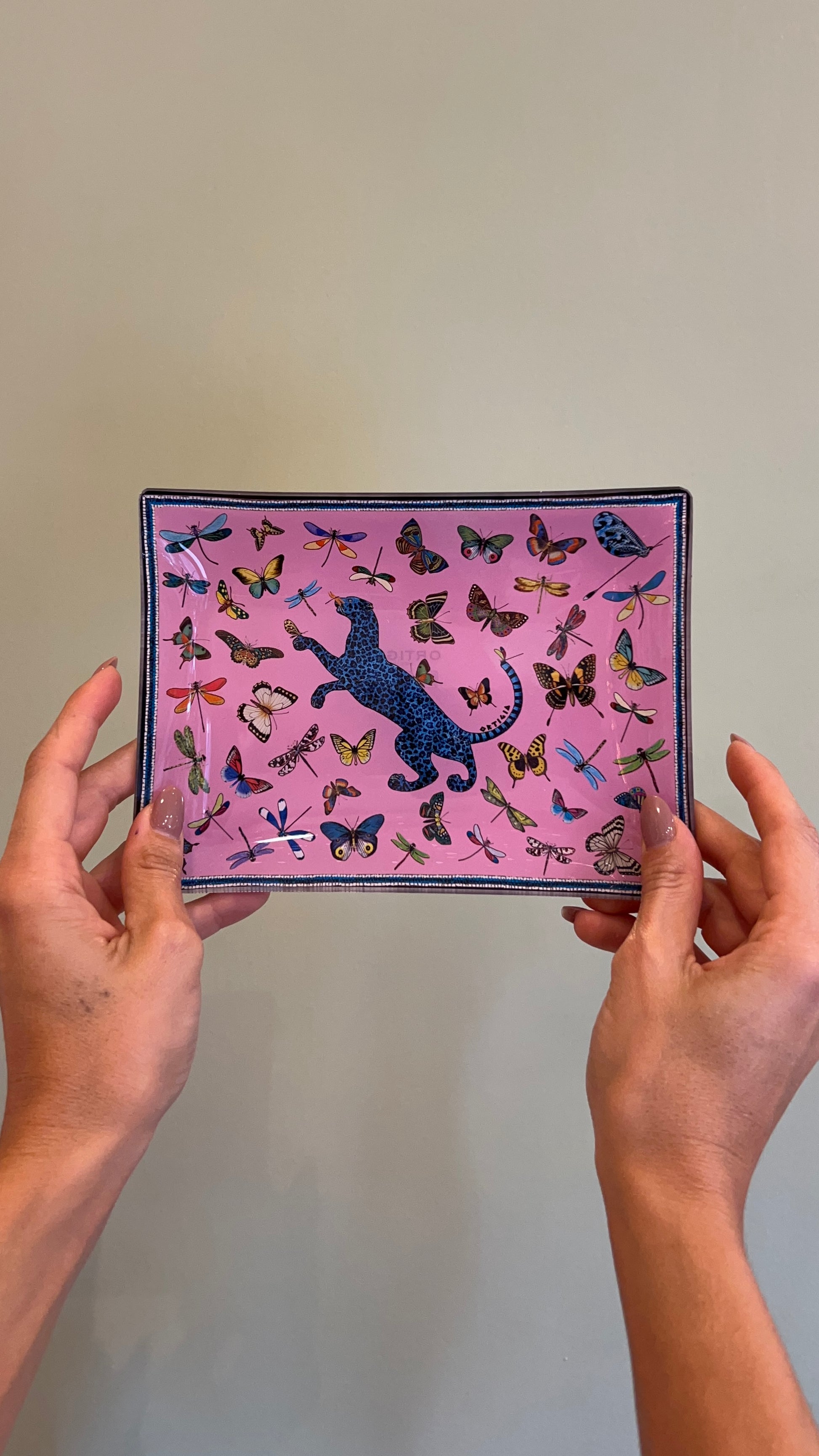 Scatola in latta decorata, custode di quattro piattini in vetro che evocano mondi incantati: la maestosità della Palma, il mistero della Giungla, la delicatezza delle Libellule, e l’eleganza del Fishy.
