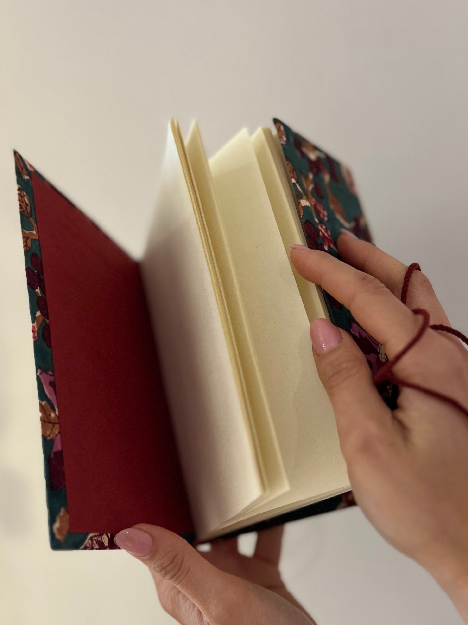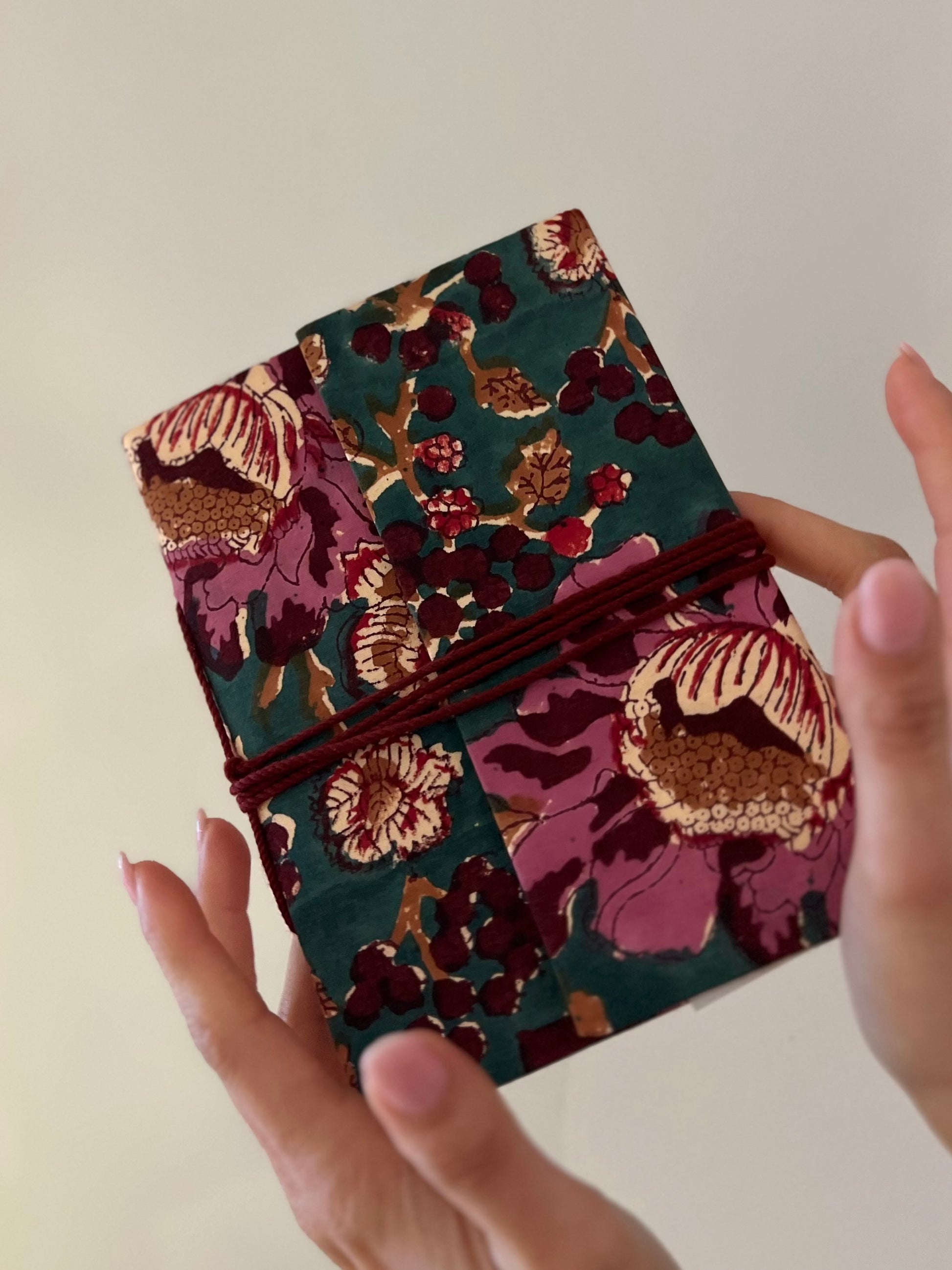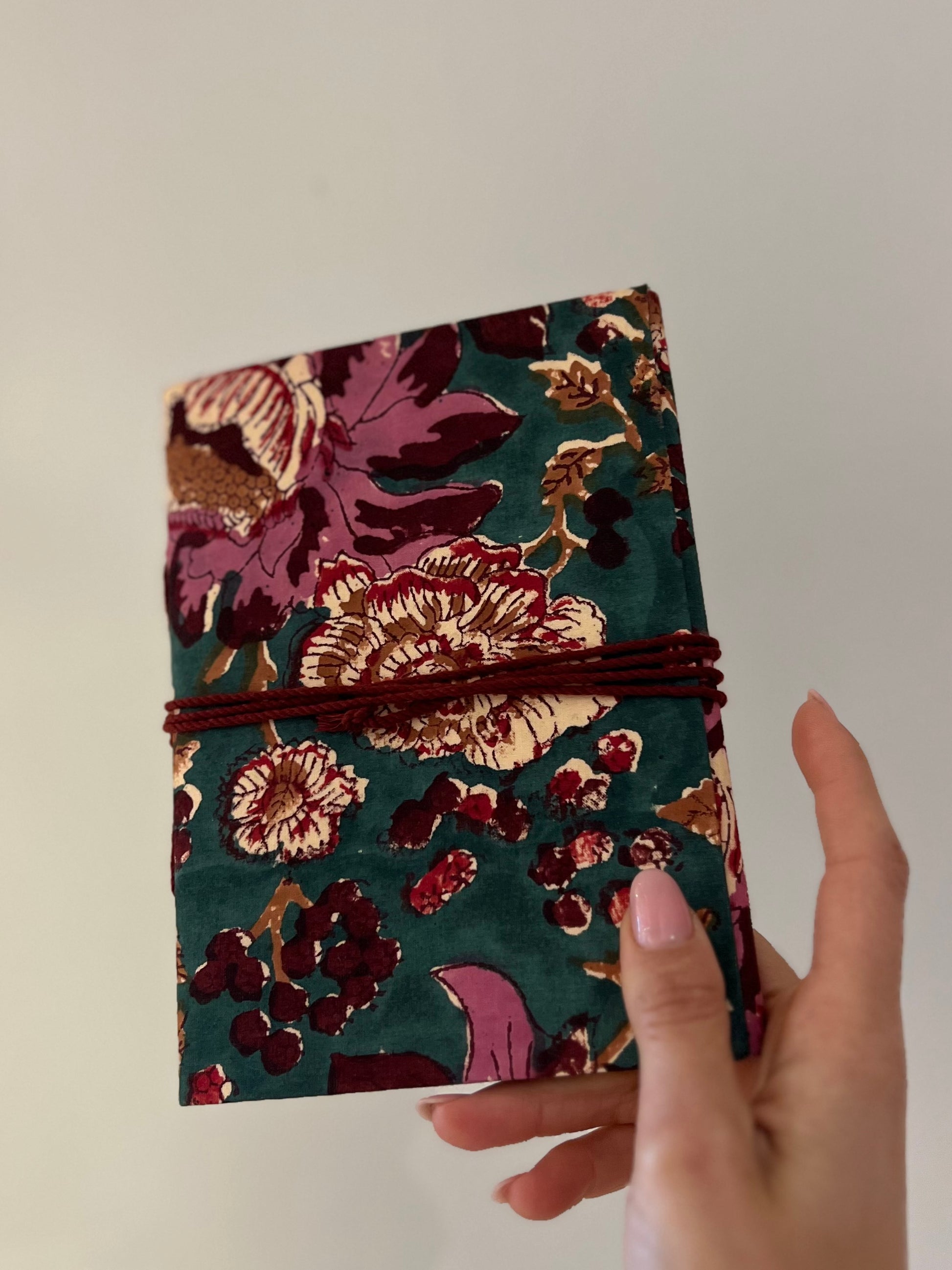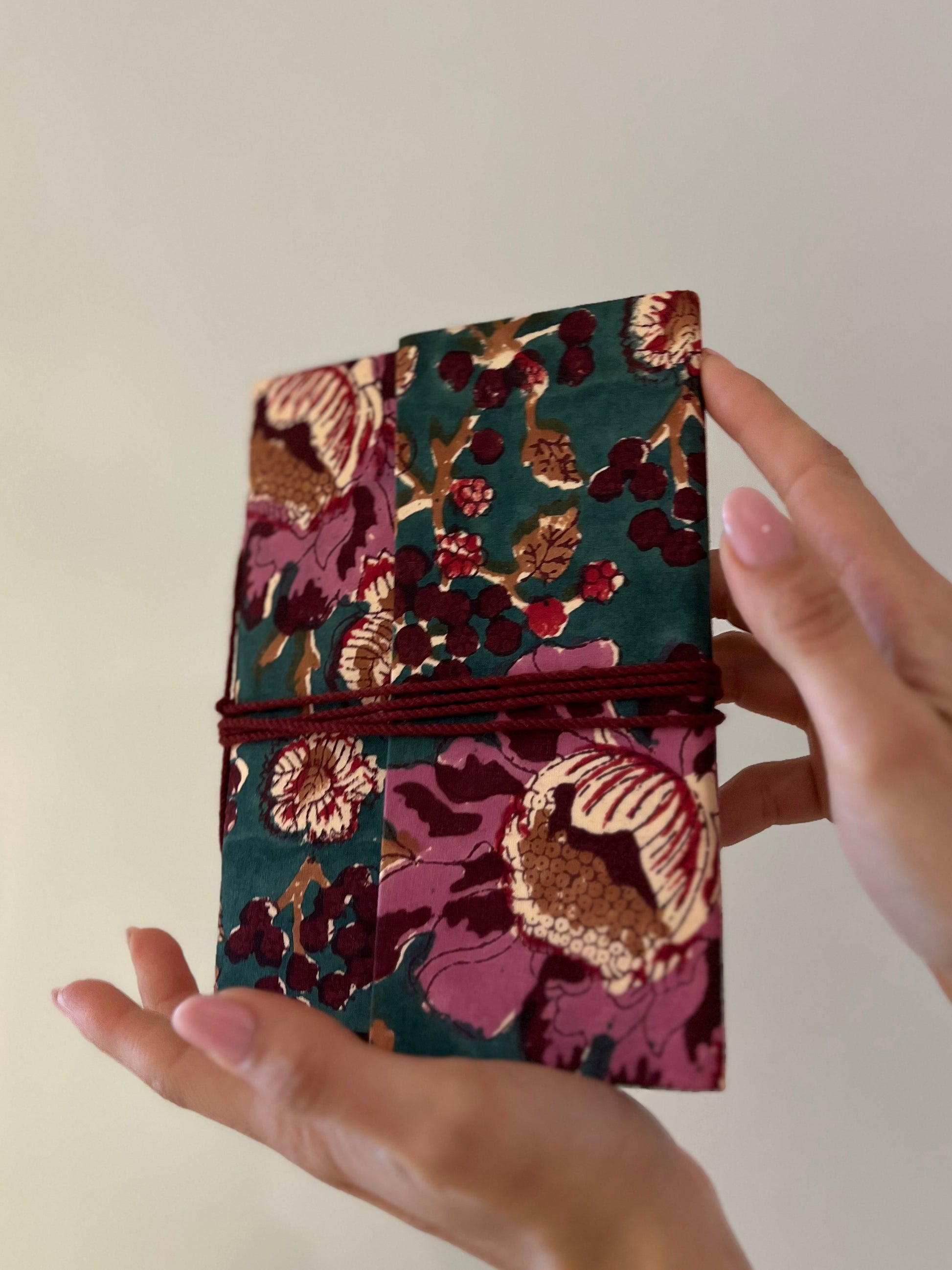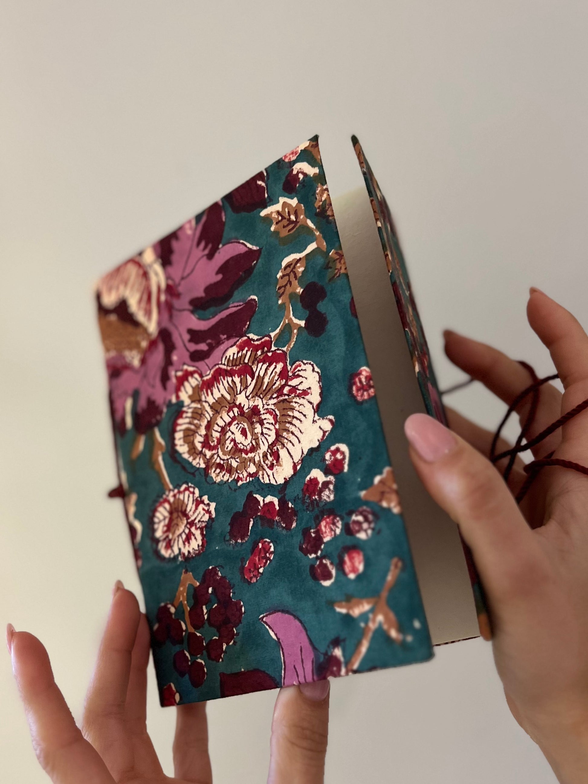 Il rivestimento in tessuto stampato a blocchi di legno, realizzato artigianalmente in India, conferisce un tocco di calore, unicità e poesia ad ogni pezzo. Si chiude con un delicato laccio in cotone, per proteggere i tuoi pensieri più preziosi.