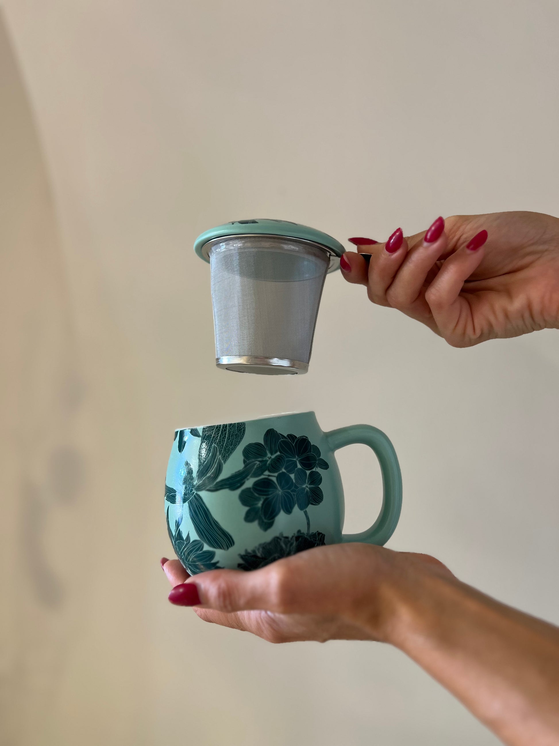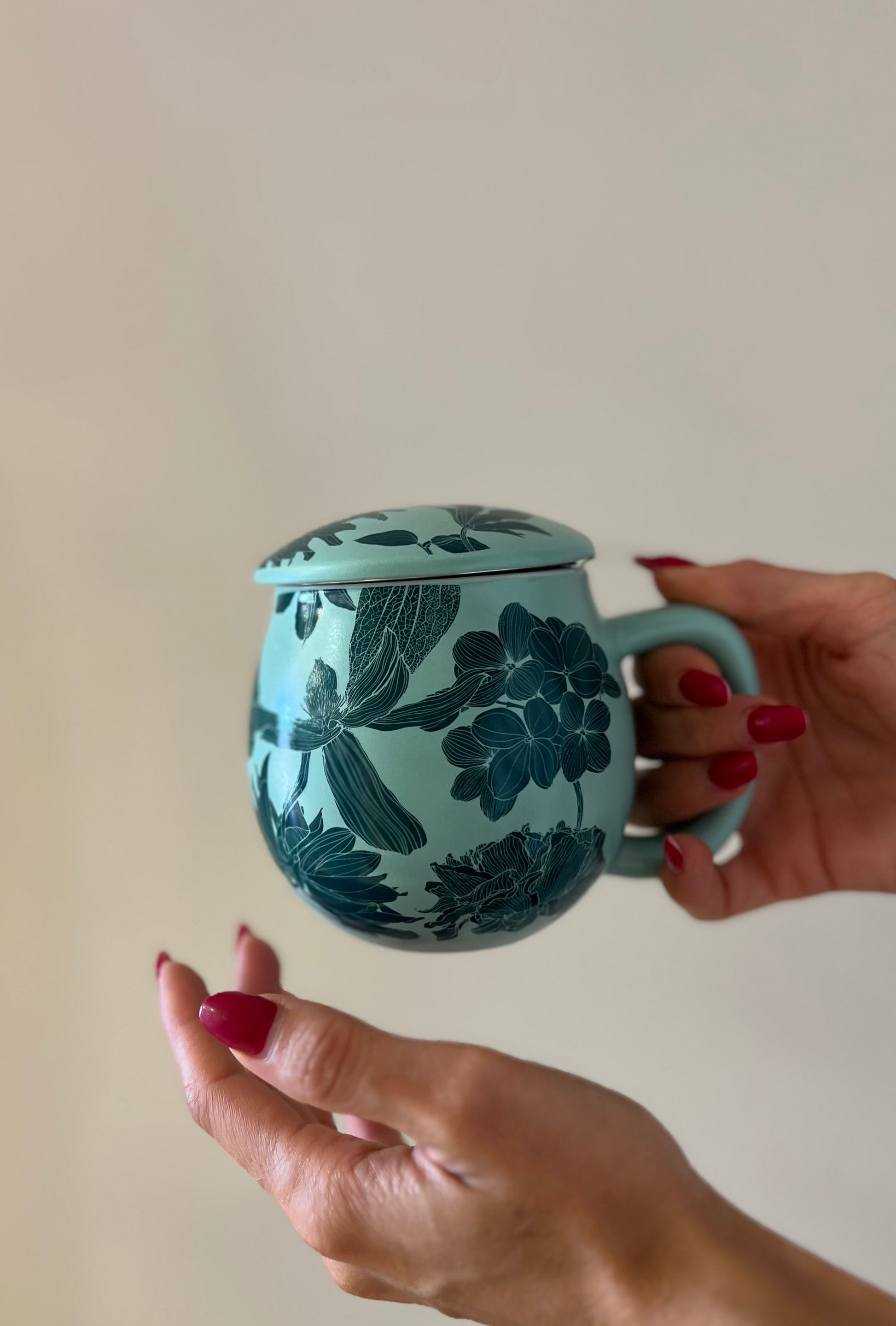 I rilievi delicati e la tonalità verde acqua evocano freschezza e leggerezza, trasformando la tisaniera in un piccolo capolavoro artistico da ammirare.